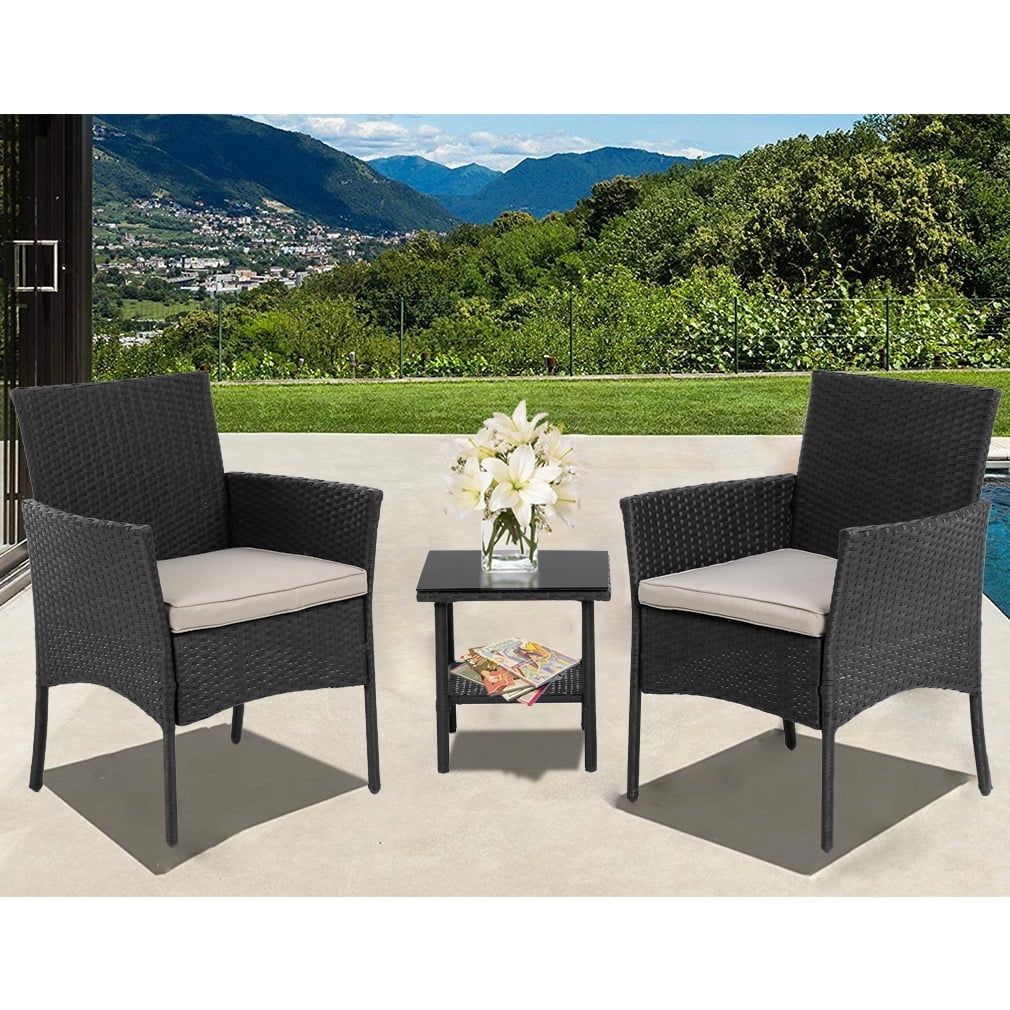 3 Pieces Outdoor Patio Furniture Wicker Table and Chairs Set Bar Set with Cushioned Tempered Glass, Black 3 Pieces Outdoor Patio Furniture Wicker Table and Chairs Set Bar Set with Cushioned Tempered Glass, Black 3 Pieces Outdoor Patio Furniture Wicker Table and Chairs Set Bar Set with Cushioned Tempered Glass, Black