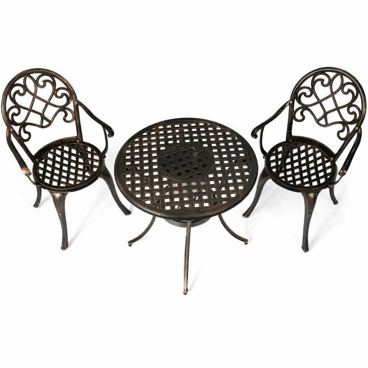 Combine with style and practical, this bistro set will add elegance to your garden, pool side; backyard, balcony and bistro. This set offers you a quiet, cozy space outdoors to host a conversations, read a book, enjoy morning coffee or whatever else you like. More, durable cast aluminum structure ensures year of worry-free use. The highlight of this bistro table set is removable stainless steel ice bucket which can keep drink cold. Additionally, delicate hollow design will decor to your garden and gives your guest a deep impression.