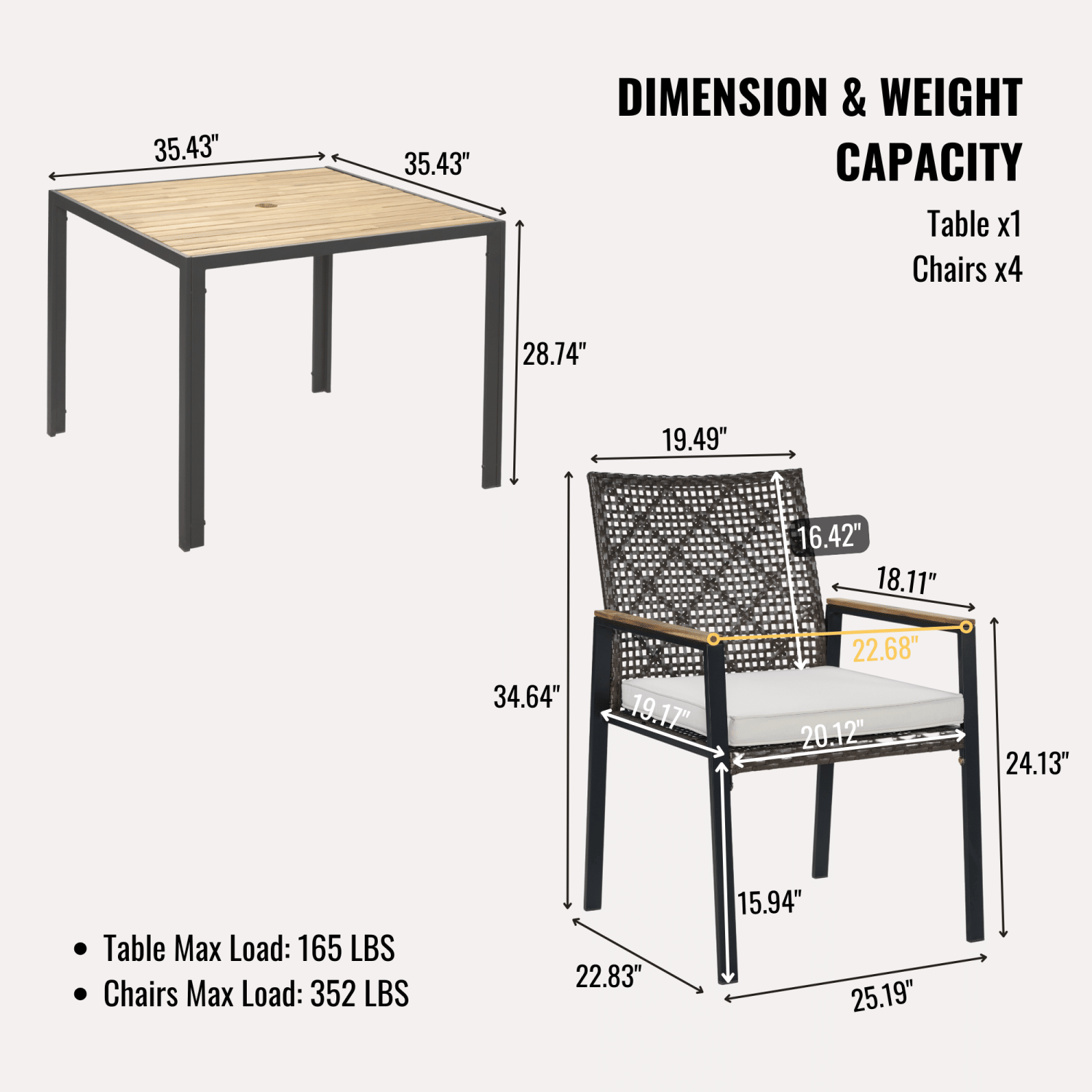ONE SET: includes Four chair size 22.83 x 25.19 x 34.64 inches; One table size 35.43 x 35.43 x 28.74 inches, clear instruction paper and extra a free part of hardware for replacing in case needed.