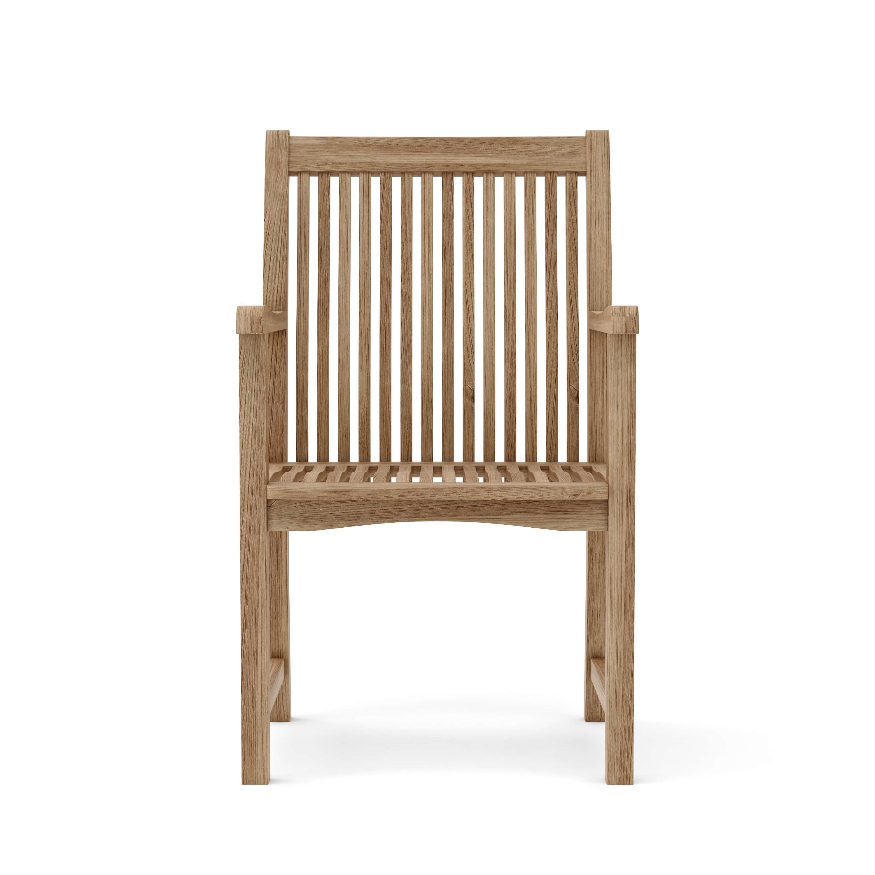 The Chicago Dining Armchair is a classic piece of furniture that will never go out of style, but quietly blends with any décor or setting. The seat is sculpted for added comfort but is also sturdy, as is the back support that’s made of individual teak slats. Made with kiln-dried, Grade-A Teak wood, it is the perfect material for weathering the outdoors. Place this chair in your backyard with a dining table for an outdoor dining experience. Overtime, the chair will weather into a patina grey, or scrub down with soap and water to keep in pristine condition. This is a beautiful and functional piece of furniture for your patio or terrace.