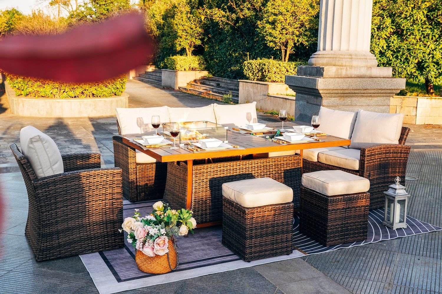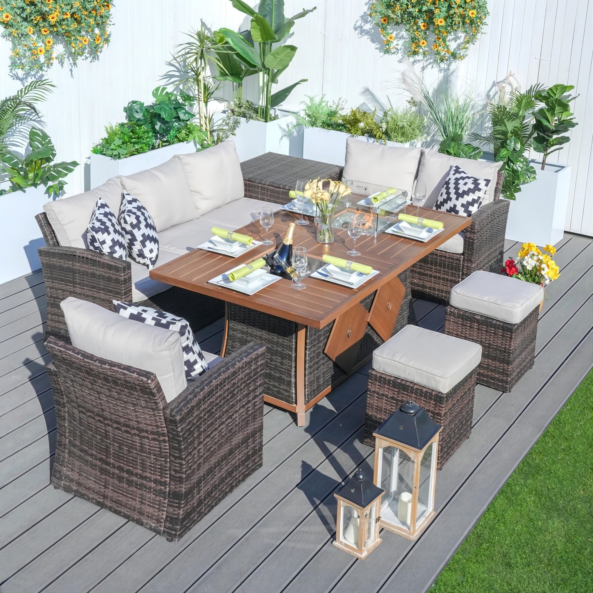 Brighten the look of your outdoor space with this 7-Piece Patio Conversational Sofa Set With 1 Gas Firepit And Ice Container Rectangle Dining Table And 2 Ottomans. We upgrade the fragile glass and rattan tabletop to a brown finish aluminum coating tabletop, which can extend the service life of this product.  In addition to the original firepit system, we have added an ice container function, which allows you and your family to enjoy the beautiful fire while also enjoying a delicious beverage.  It can meet your various outdoor needs. The encounter of fire and ice will bring you double enjoyment.
