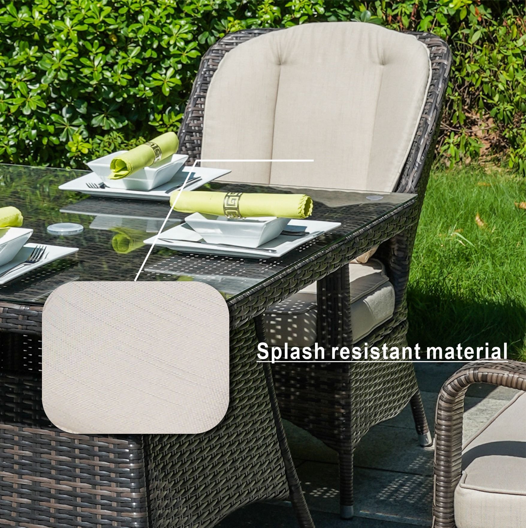 This deluxe dining set with 4 curved chairs offers supreme comfort; grandeur and sophistication for your garden. Made with the highest quality hand-woven rattan; the Malachi dining set comes complete with tempered glass and seat cushions. With its square table and cozy chairs; the Malachi garden set is perfect for intimate alfresco dining. The Dining set is low-maintenance; frost proof; rust resistant and weather resistant. High-quality rattan. The rattan dining/lounge set is made from some of the highest grade brown rattan around - you can rest assured that the Malachi has been designed and created to withstand not only the test of time but also the test of elements. Luxury high-quality cushions. The cushions on the Malachi are durable and supremely thick; providing you with unparalleled comfort. The cushions are made from luxury fabric and also contain quick drying foam with washable covers; making them excellent for year round usage.