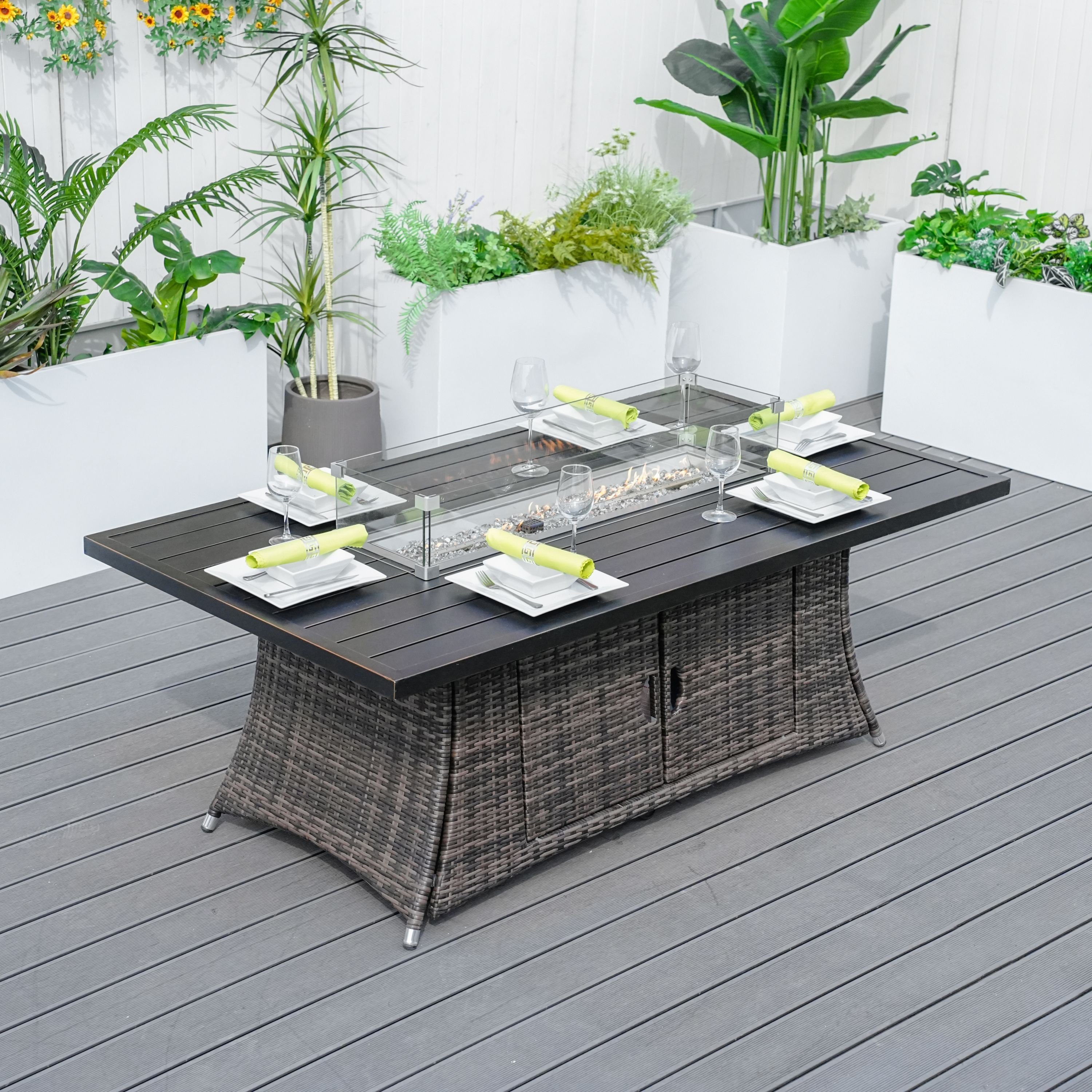 Direct Wicker Patio Fire Pit Dining Set 6-Seat Rectangular Aluminum Table with Rattan Chairs