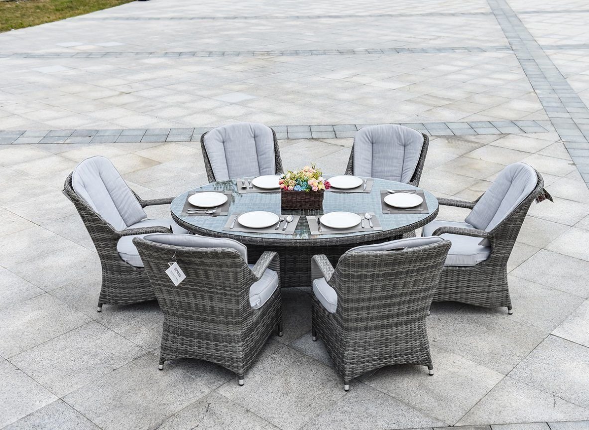 This deluxe dining set with 6 curved chairs offers supreme comfort, grandeur and sophistication for your garden.
