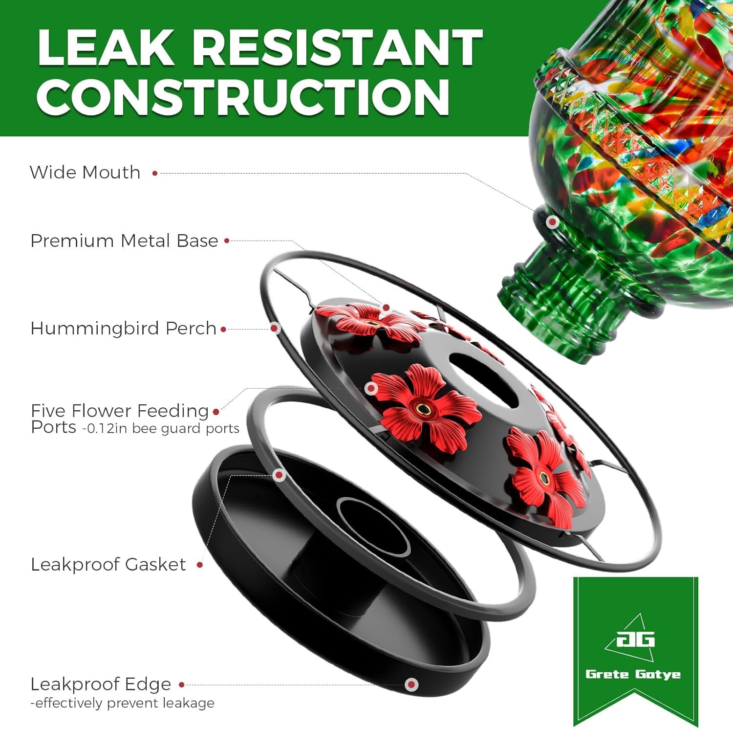 Hand Blown Glass Hummingbird Feeders for Outdoors, 25 Ounces Wild Bird Nectar Feeder with Perch & 5 Flower Feeding Ports Leak Proof Hanging for Garden Backyard Decor, Gifts for Women Mom, Green