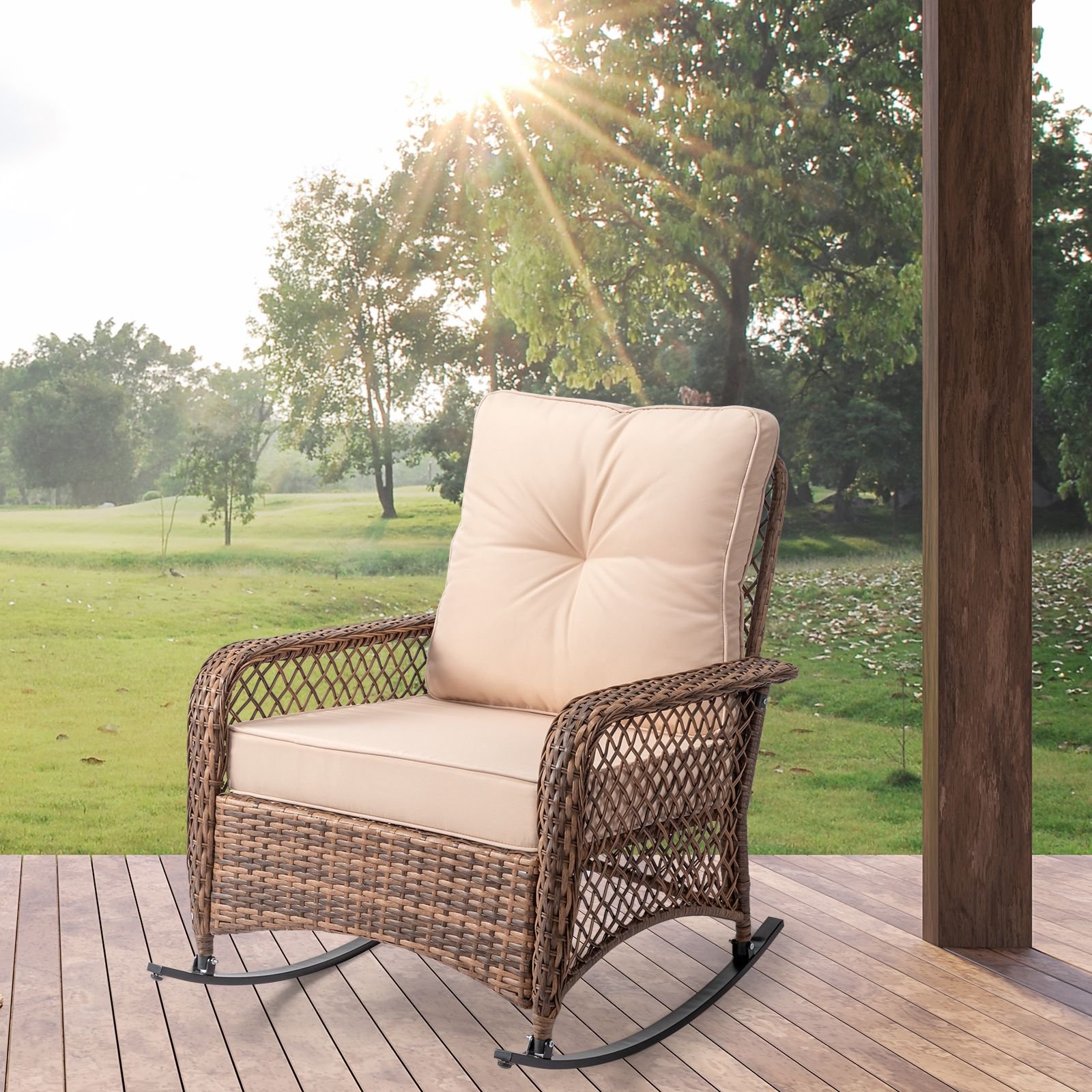 Modern Porch Wicker Rocking Chair for Outdoor Patio,All Weather Rattan Rocker,Brown Rattan, Beige Cushion Modern Porch Wicker Rocking Chair for Outdoor Patio,All Weather Rattan Rocker,Brown Rattan, Beige Cushion Modern Porch Wicker Rocking Chair for Outdoor Patio,All Weather Rattan Rocker,Brown Rattan, Beige Cushion