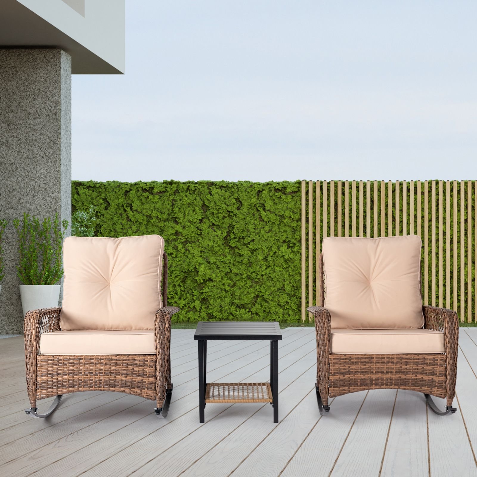 Features heavy-duty constructed stainless steel frame and all-weather polyester hand-woven rattan, the rattan rocking chair withstands rain, sun exposure, and wind effortlessly. It is not easily deformed or damaged in long-term use, and can stand the test of time.High-density sponge cushions offer maximum comfort. The patio rocking chair features durable cloth that is fade resistant, slight waterproof. The bottom cushion can be removed by zipper design that it is removable and washable for easy cleaning, breathable and comfortable will not collapse for a long time using.