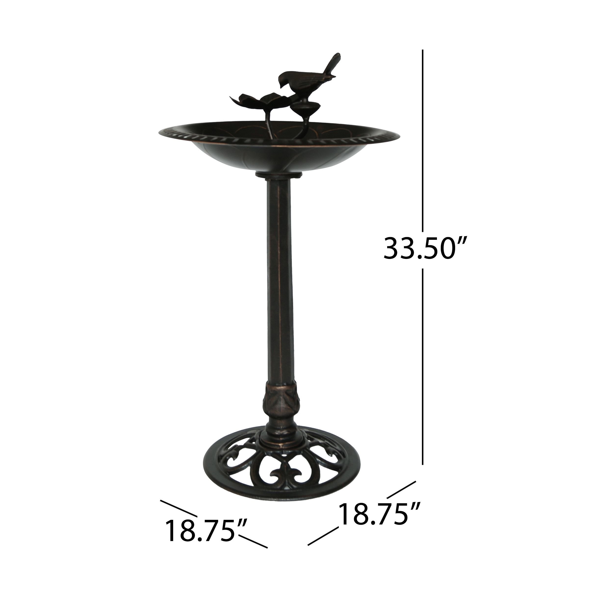 Includes One (1) Bird Bath. Material: Rust-Proof Cast Aluminum. Base Material: Cast Iron. Finish: Shiny Copper.