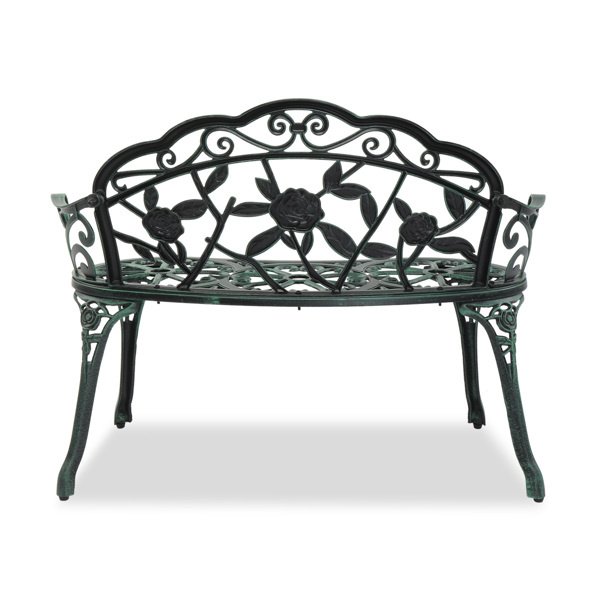 Outdoor Cast Aluminum Patio Bench, Porch Bench Chair with Curved Legs Rose Pattern, Antique Green(SAME AS 91404878)