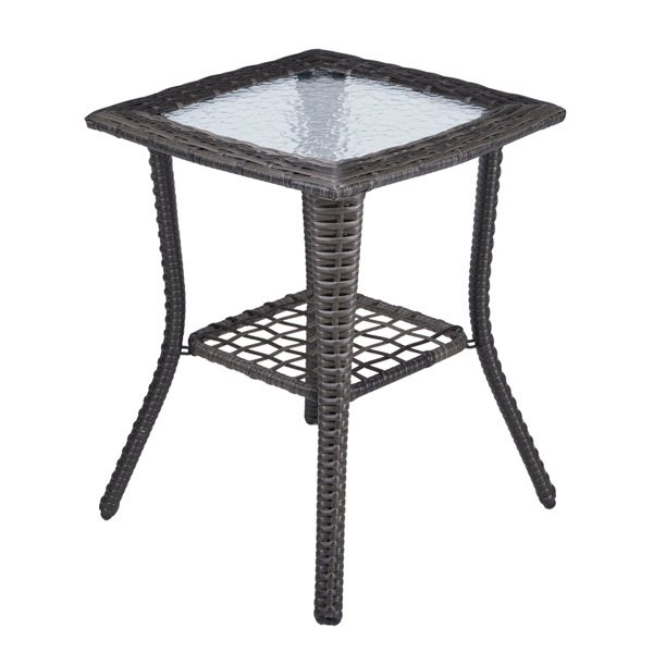 Elevate your living space with our Outdoor Wicker Side Table, a perfect blend of style and functionality. Designed for both indoor and outdoor environments, this table showcases a sophisticated hand-woven wicker pattern paired with a unique water ripple-patterned tempered glass top. Constructed with a durable powder-coated steel frame and all-weather wicker, it guarantees longevity and resilience against the elements. The table's two-tier design not only enhances its visual appeal but also offers ample storage space. With easy assembly and a versatile design, this side table is an essential addition to your garden, porch, balcony, or living room.