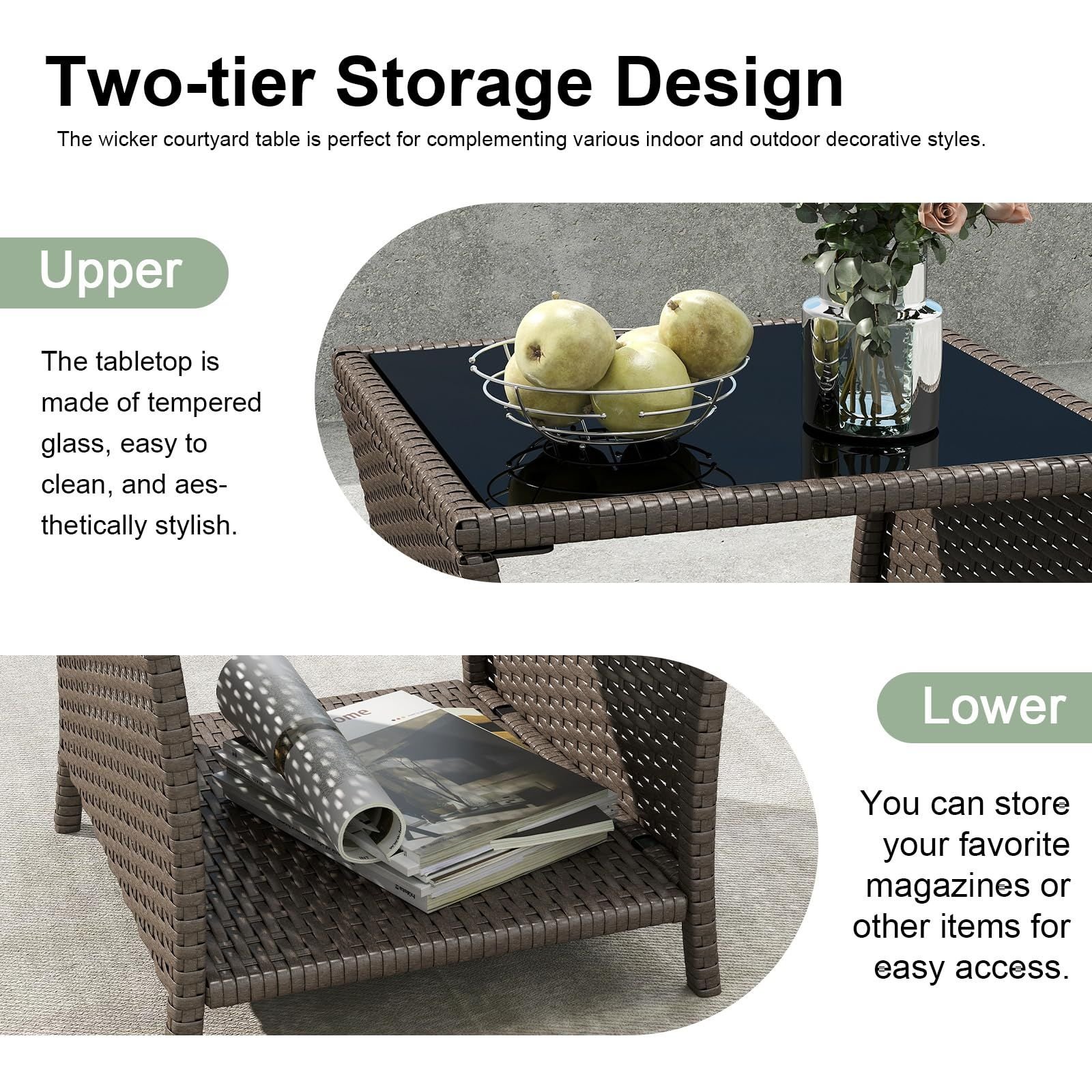 2.Easy-Clean Tempered Glass Top: The rattan end table features a scratch-resistant glass surface for effortless maintenance, ideal for snacks, drinks, or decor on patio tables for outside.