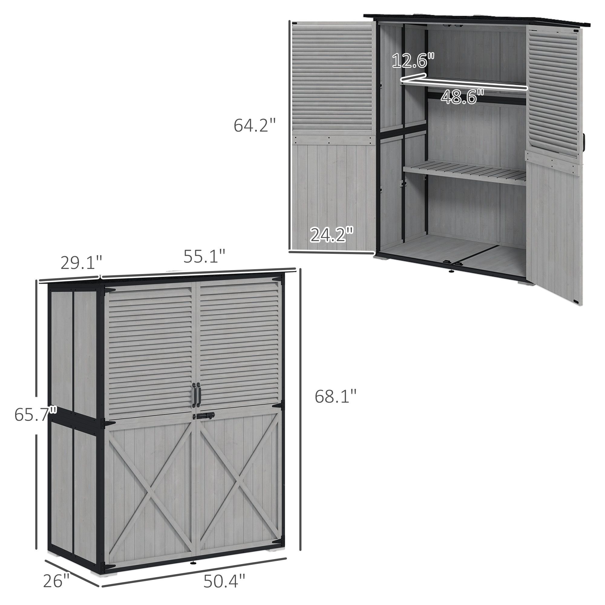 Transform your backyard with the Outsunny Wooden Garden Shed! Crafted from solid varnished wood and a robust steel frame, the wooden shed features an asphalt pent roof to prevent water buildup. Two adjustable shelves keep your tools neatly organized, while shuttered doors with a secure latch ensure everything stays safe and ventilated. Adjustable feet provide stability on uneven ground, making it a great outdoor storage solution.