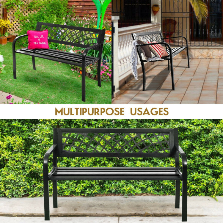 1.Stable and Long-Lasting Metal Bench Frame: This outdoor bench is mainly crafted of high-quality and durable steel which is sturdy enough and handled with exquisite finish coating to maintain rust and weather resistant. Two front legs integrated with two armrests and rear legs combining with the backrest form a solid construction.
