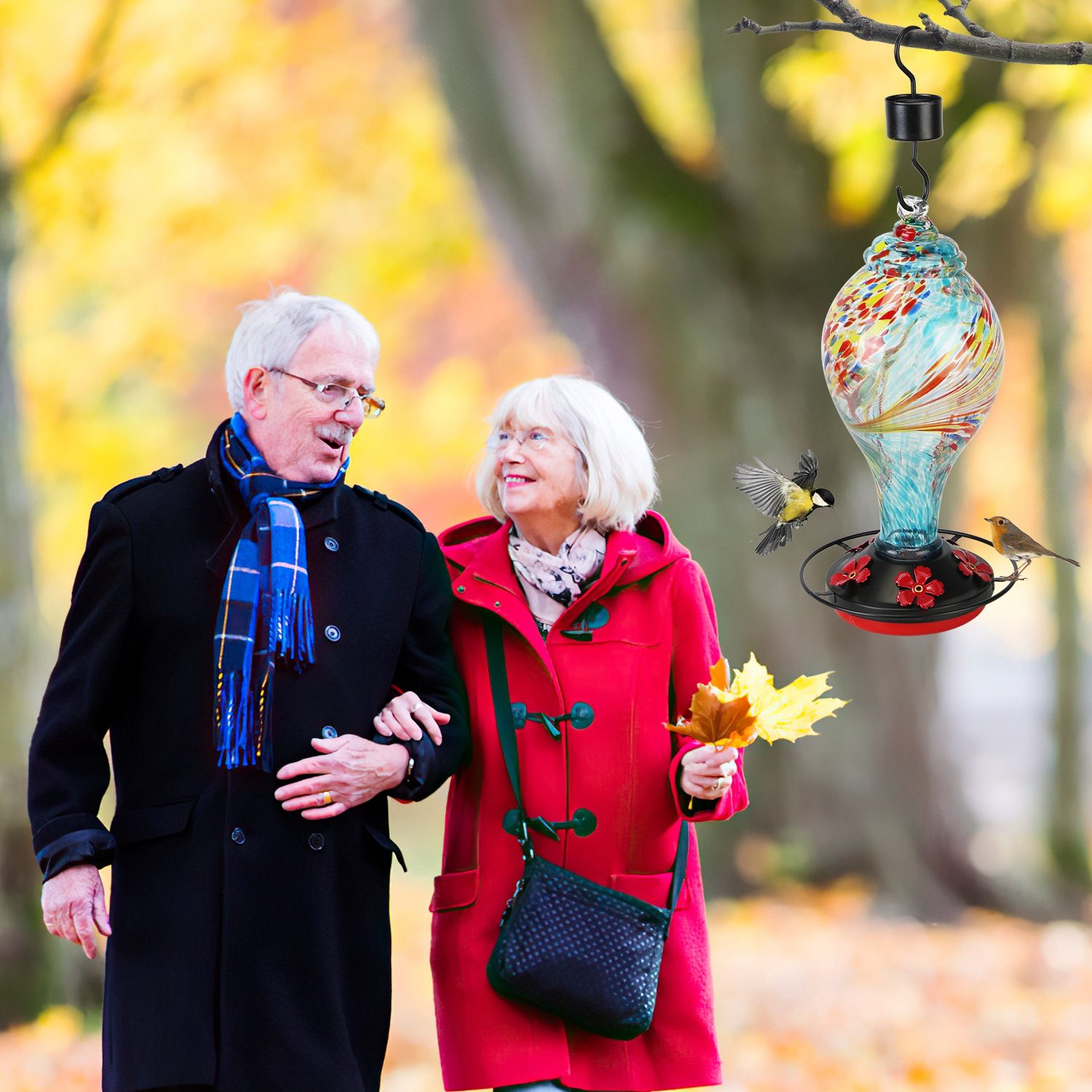 *Handcrafted Glass with Wonderful Colors*:This beautiful hummingbirds feeders is not only great to attract more birds to your garden,but also can be used as an elegant garden ornament with its aesthetic appearance,adding a touch of sophistication to your outdoor space. A perfect gift for birds lovers,gardeners and your grandfathers in Anniversary,Birthday,Father's Day,Thanksgiving and Christmas.