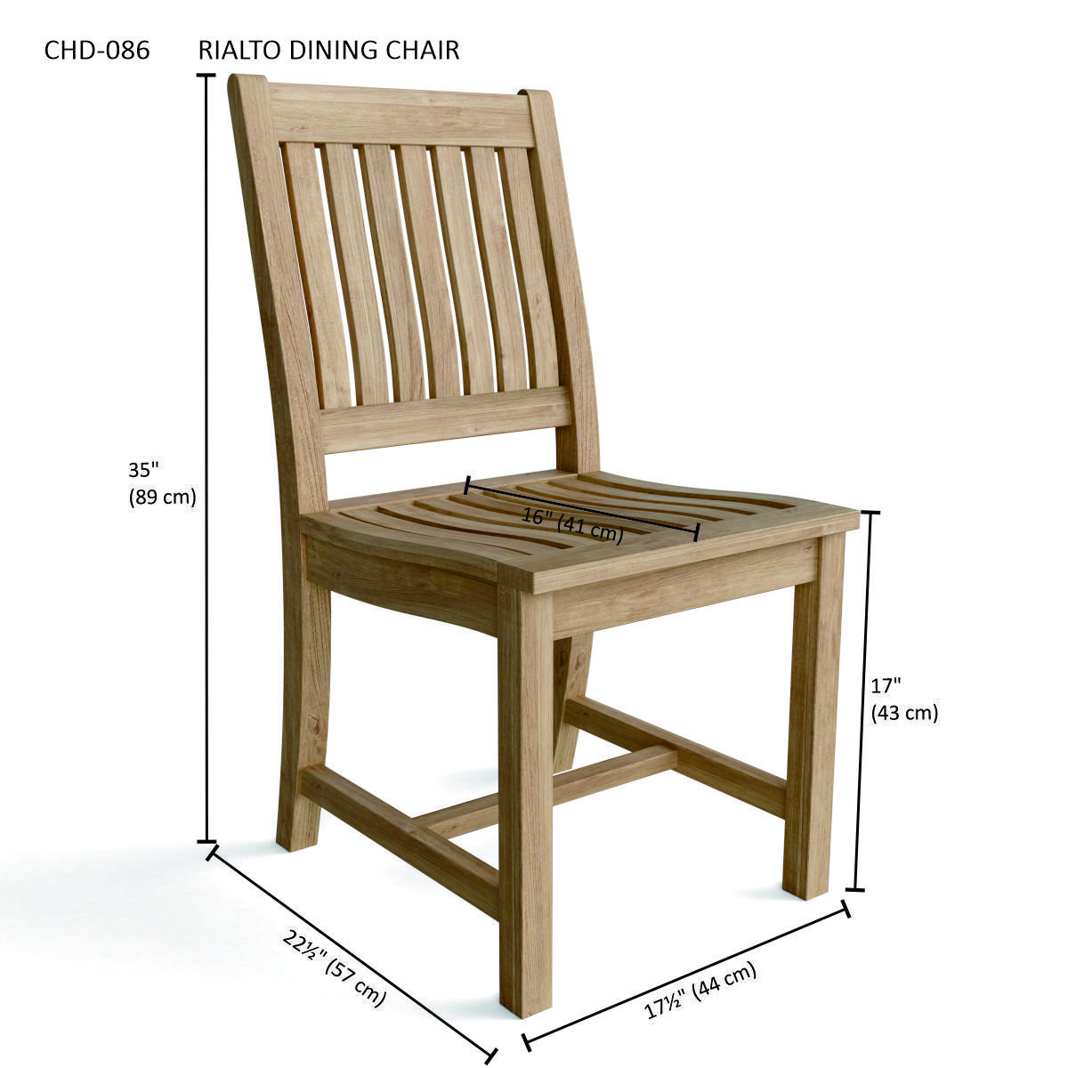 The Rialto Dining chair features high back support adding comfort to your lumbar for a comfortable dining experience. Designed with a classic taste, the looks of this chair will never go out of style, but quietly blends with any decor or design. The seat is very sturdy as well as the back, made with kiln-dried, Grade-A wood sanded smooth without finish. Assembly required with instructions and all necessary parts included. Made from the finest solid teak, which is strong and durable. This is a beautiful and functional piece of furniture for your patio or terrace. Place this chair in your backyard with a dining table to create an outdoor dining experience.