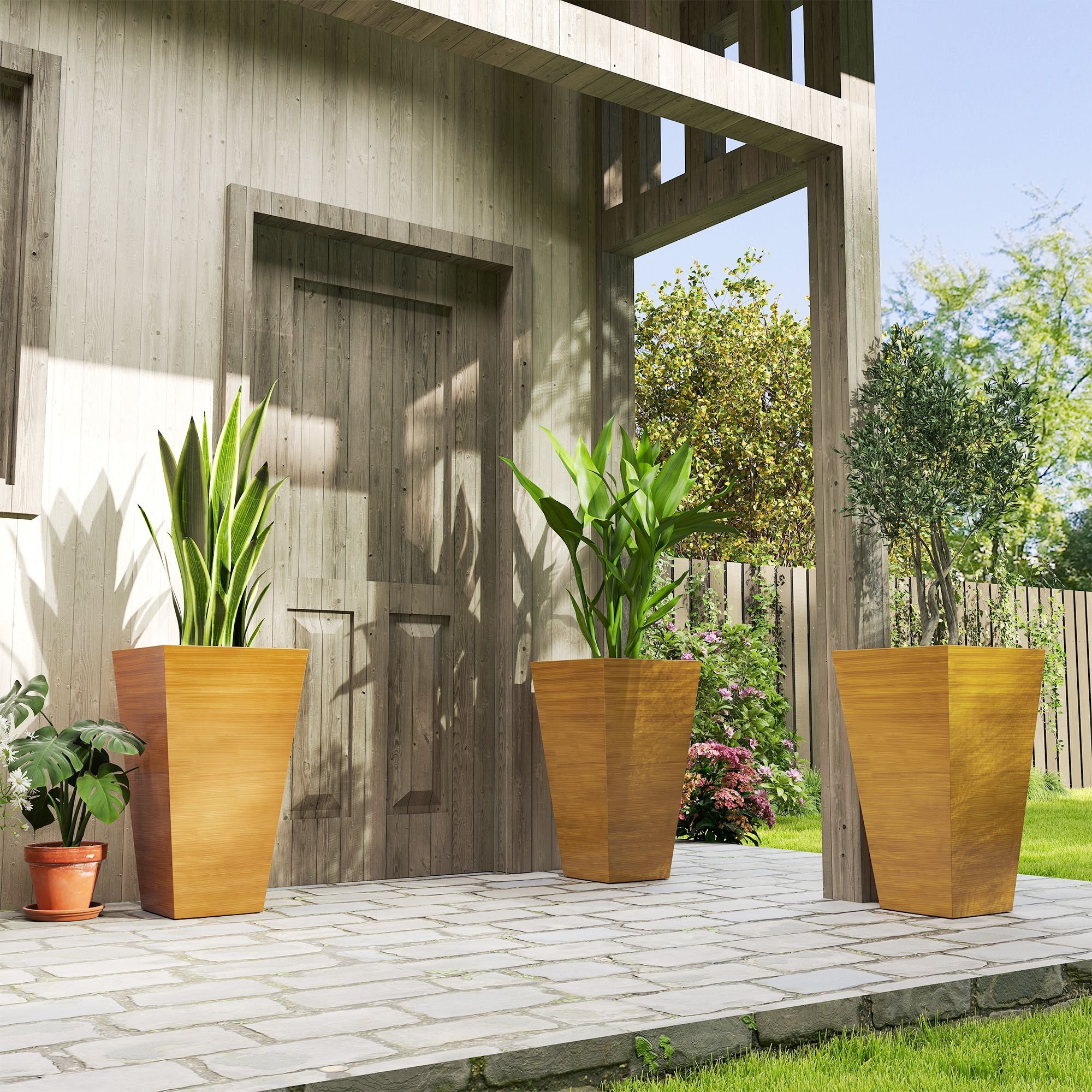 Landscaping is easy with the right supplies by your side. Outsunny's outdoor planter set gives the depth you need to grow long roots without taking up extra room when it's time to store for the season. Grow flowers, herbs, shrubs, ferns, or a ficus. Our tall planter set is self-draining, so water logging won't be a worry. They're stackable to keep compact when not in use. Featuring a modern shape with a wood grain look, their material doesn't saturate to endure the outdoors season after season.